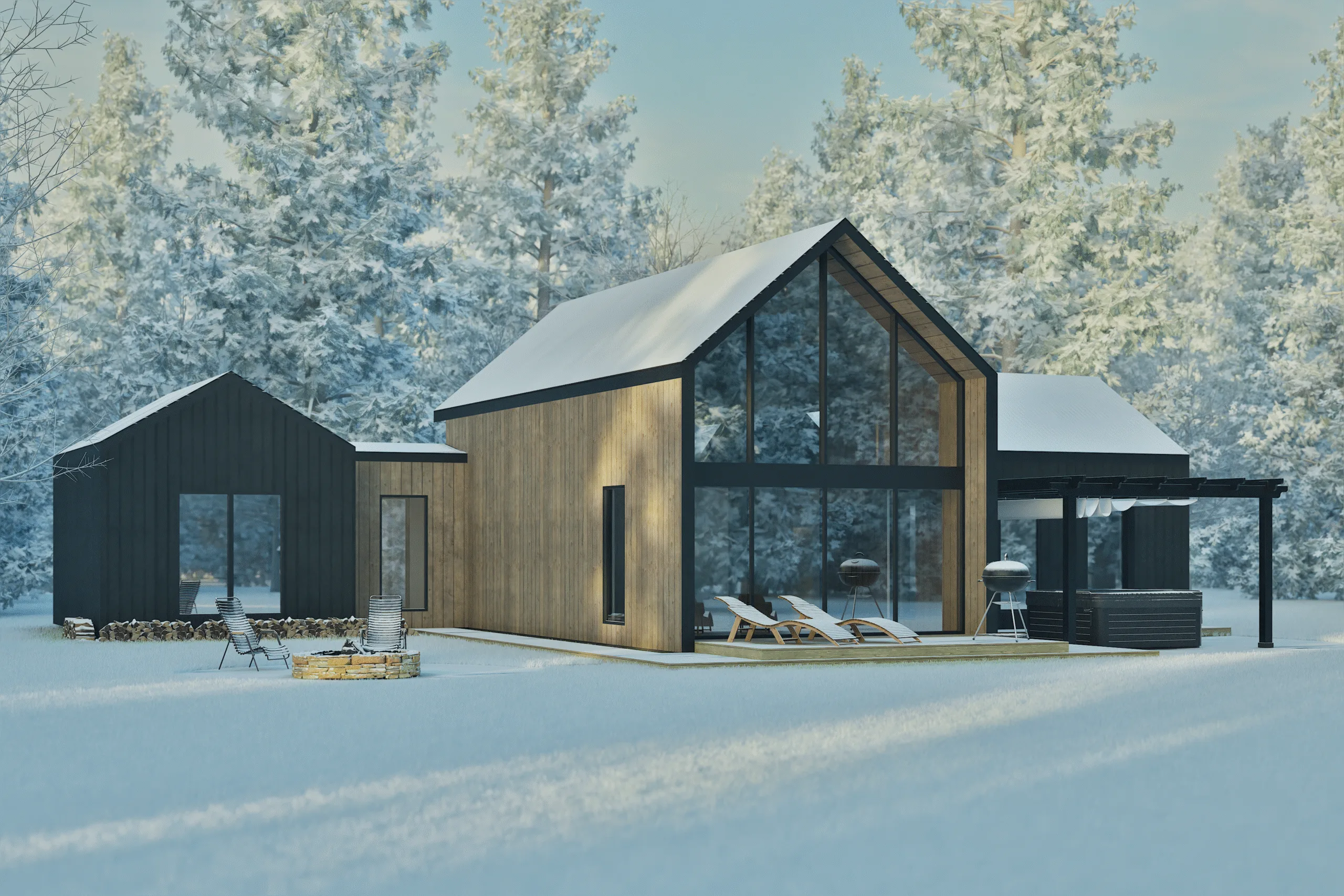 À l’extérieur, un foyer en pierre et un aménagement paysager épuré invitent à profiter des longues journées d’été en pleine nature. Ce chalet est un véritable havre de paix, où design scandinave et art de vivre au grand air se rencontrent pour offrir une expérience à la fois fonctionnelle et chaleureuse.