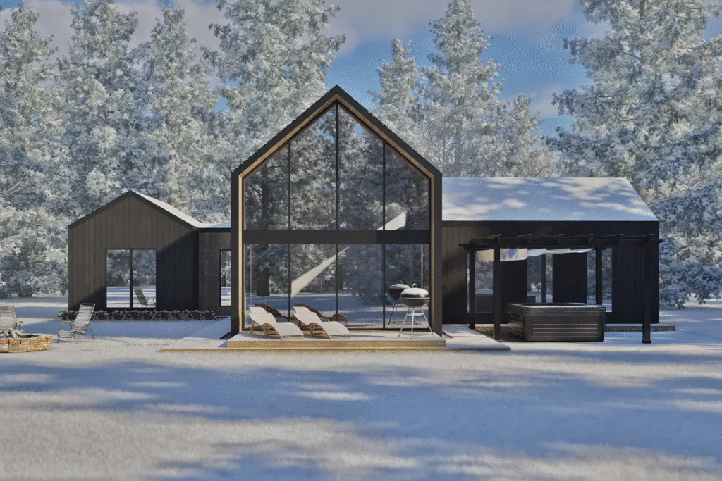 Cette maison d’inspiration scandinave a été conçu pour s’intégrer harmonieusement à son environnement naturel tout en offrant un cadre de vie moderne et lumineux. Son architecture minimaliste, caractérisée par un revêtement en bois foncé et une toiture à deux versants, évoque les chalets nordiques traditionnels tout en adoptant une approche résolument contemporaine.